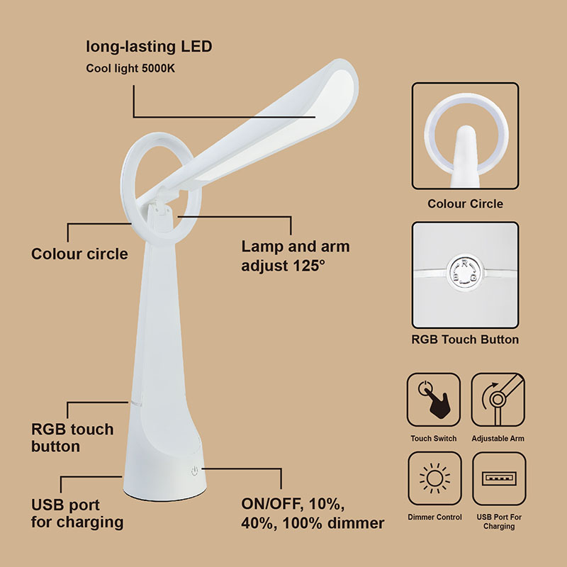 Decor rgb led světlo stolní lampy může 3 stmívat zpět na těle produktu. Hlava LED světla se může otevřít o 125° max.