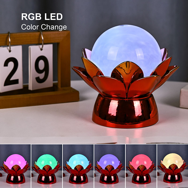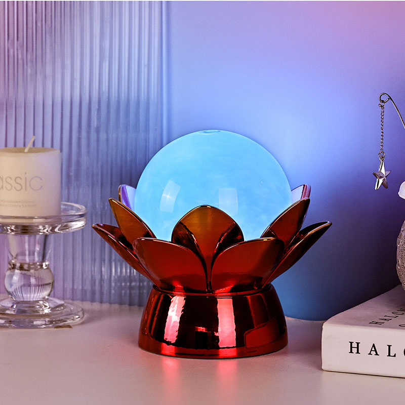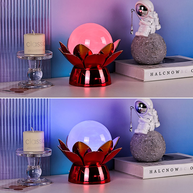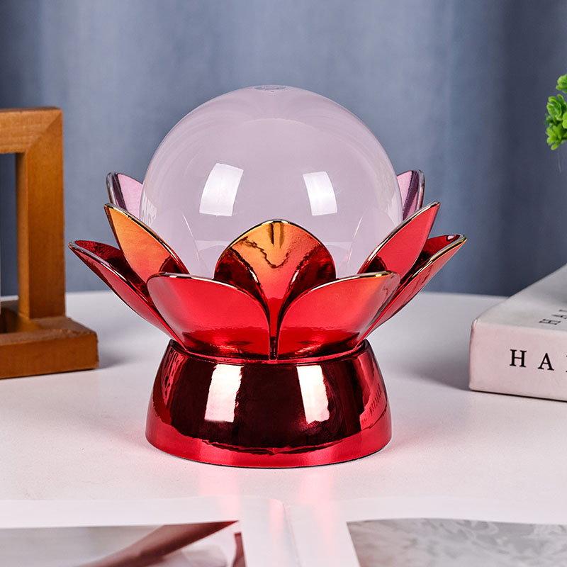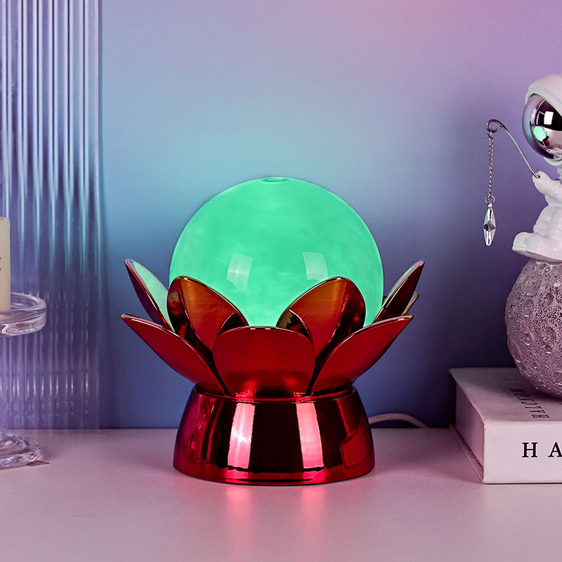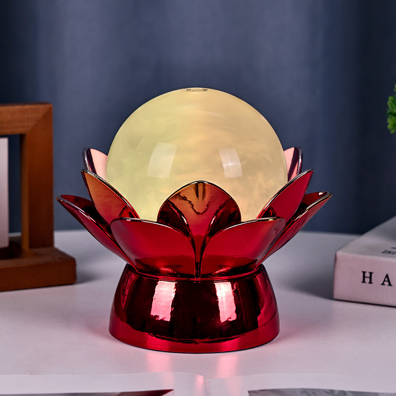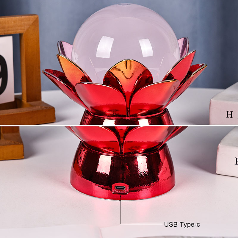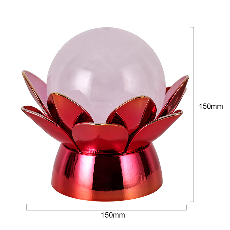 Základna je vyrobena z vysoce kvalitních materiálů a je vyrobena z leštěného kovu s nápadným červeno-zlatým povrchem, který krásně odráží světlo a dodává jeho vzhledu hloubku a bohatost. Lotosový design slouží nejen jako estetický ústřední bod, ale také nese symbolický význam zakořeněný ve východních tradicích – představuje osvícení, odolnost a harmonii. Reflexní povrch zvyšuje vizuální dopad, díky čemuž lampa svítí i v prostředí se slabým osvětlením.