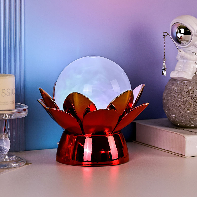 Okouzlující noční světlo Lotus Cloud Globe – fascinující spojení designu inspirovaného přírodou, uklidňující atmosféry a moderní technologie. Tato elegantní dekorativní lampa se vyznačuje průsvitnou skleněnou koulí naplněnou speciální kapalinou, která simuluje unášené mraky a vytváří klidný, éterický efekt, když jemně víří a proudí. Toto noční světlo, inspirované posvátným lotosovým květem, spočívá na nádherně zpracovaném kovovém podstavci ve tvaru rozkvetlých okvětních lístků lotosu, které symbolizují čistotu, mír a duchovní probuzení.