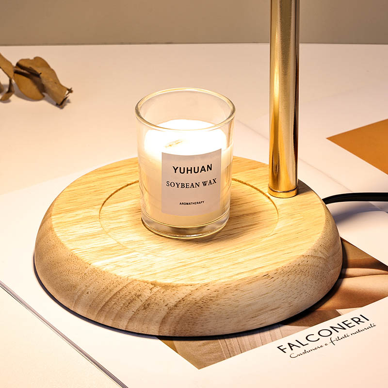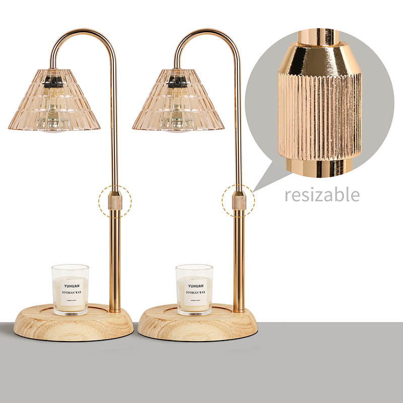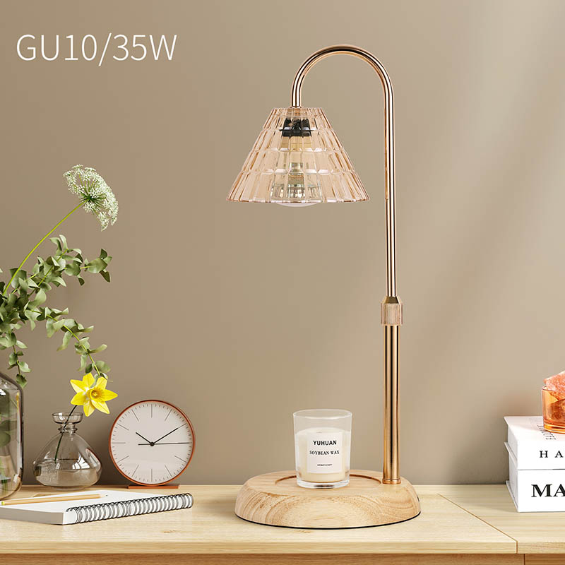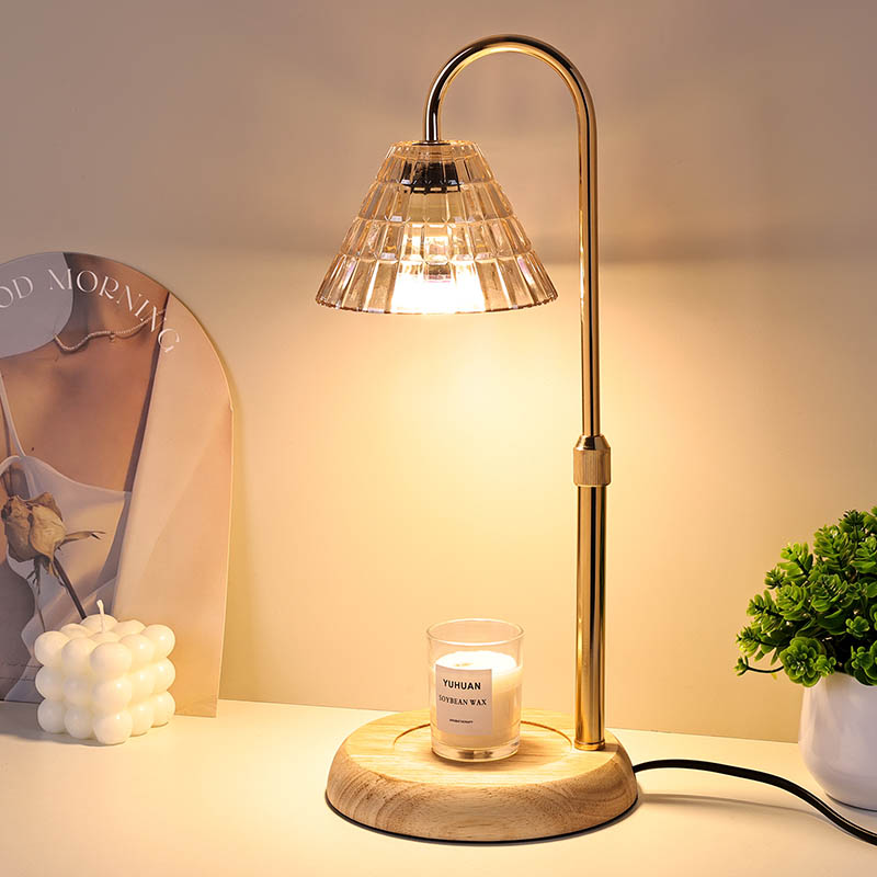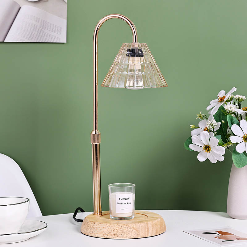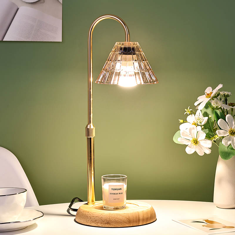 Stolní lampa se skleněným stínidlem s nastavením výšky je tradiční designový styl, který se skládá z tradiční žárovky s dřevěnou základnou a zlatého kovového sloupu lampy.