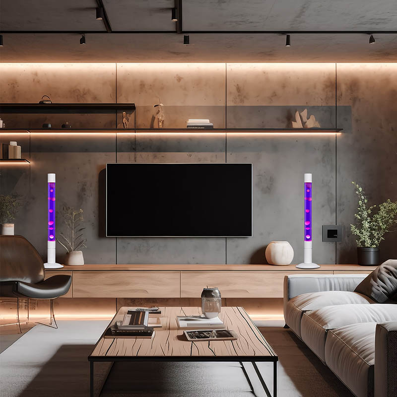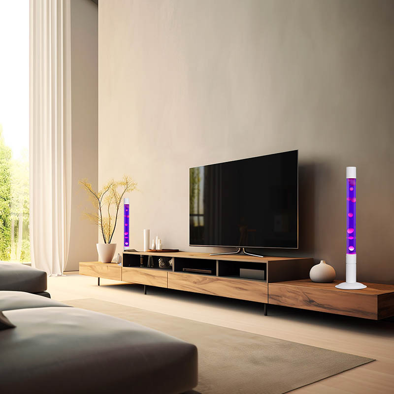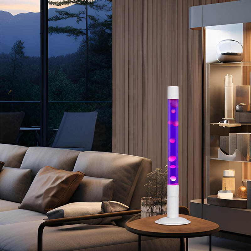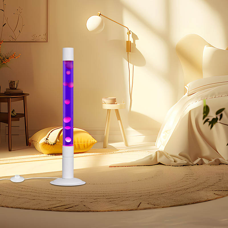 Skutečné srdce této lampy spočívá v jejím centrálním rysu: dlouhá, průhledná skleněná trubice naplněná fascinující fialovou kapalinou. Tato kapalina, připomínající klidnou lagunu u soumraku, se třpytí pod světlem a vytváří uklidňující a záhadnou atmosféru. Uvnitř této trubice se elegantně vznáší řada růžových a fialových kuliček, jejich jemné pohyby podmaní diváky a přidávají dynamický prvek do statické formy lampy.