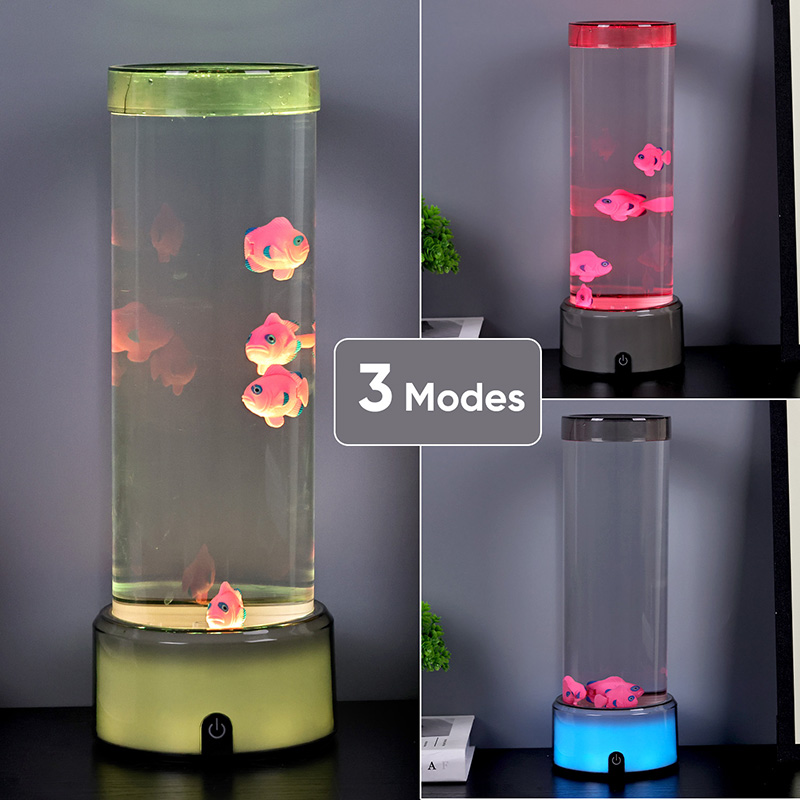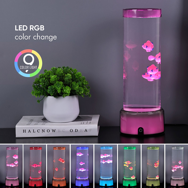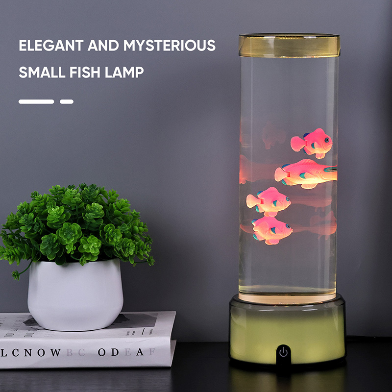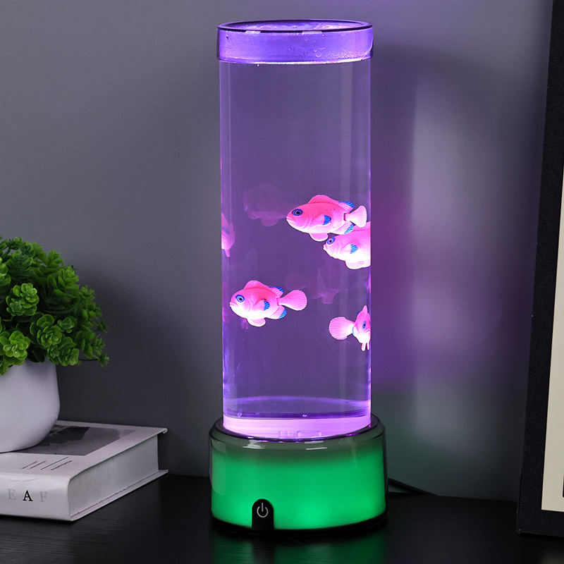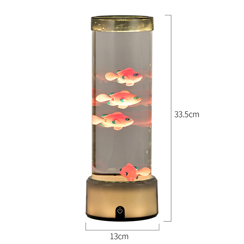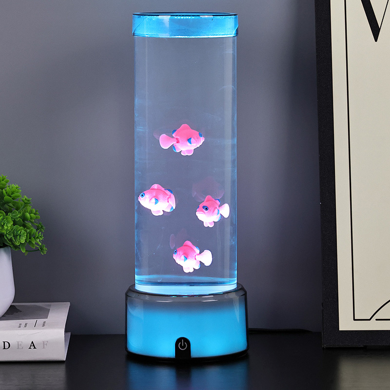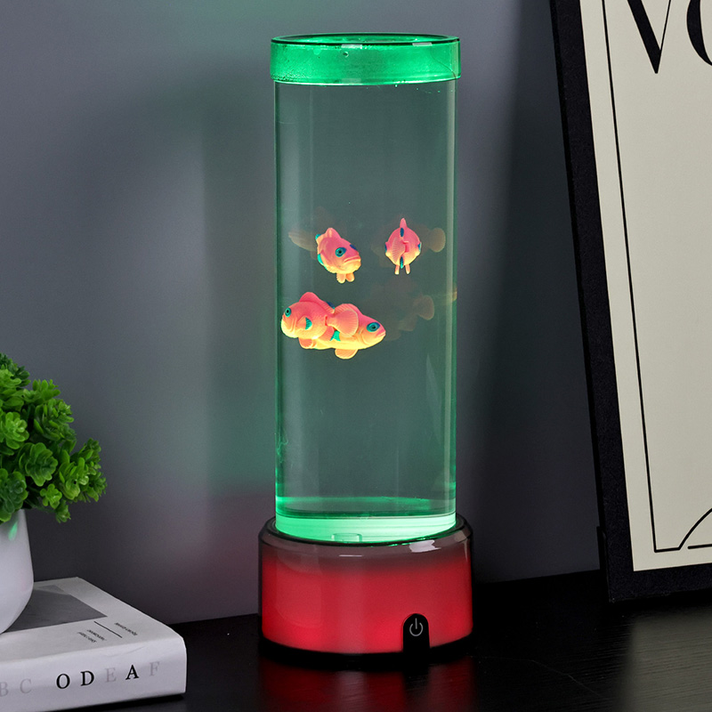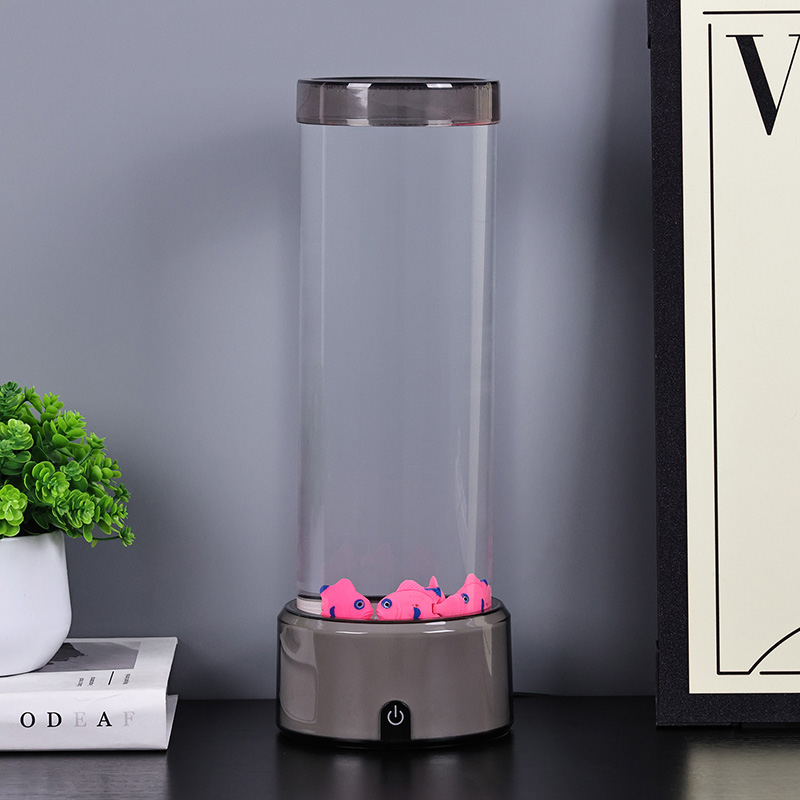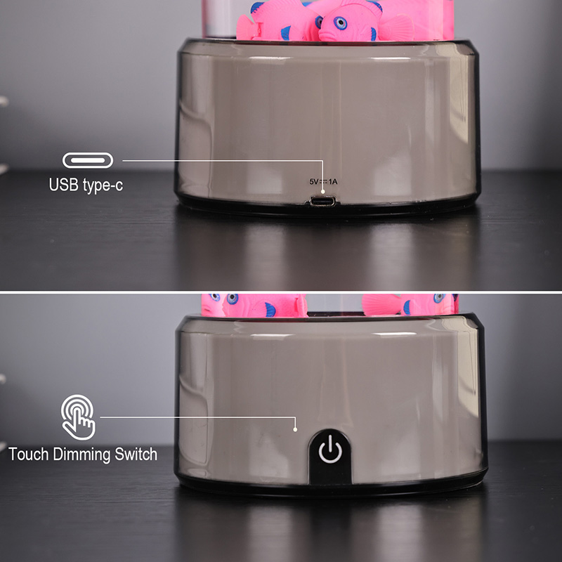 Dotykový přepínač a plavání medúzLampička na ryby s medúzou se základní dekorativní lampou RGB, nově navržená dětská hračka s válcovým designem zadržujícím vodu. Po naplnění vodou se dovnitř vloží tři rybičky. Lampa na ryby medúzy s RGB základnou může plavat nahoru a dolů, když se malý motor na dně otáčí. Zároveň má základna transformaci barev RGB. Největší předností tohoto produktu je, že s transformací barev se mění i báze. Celoplastové provedení je velmi lehké bez zadržování vody, což je velmi výhodné pro přepravu. Zdroj energie rybí lampy zajišťuje USB typu C nízké napětí, což je velmi pohodlné