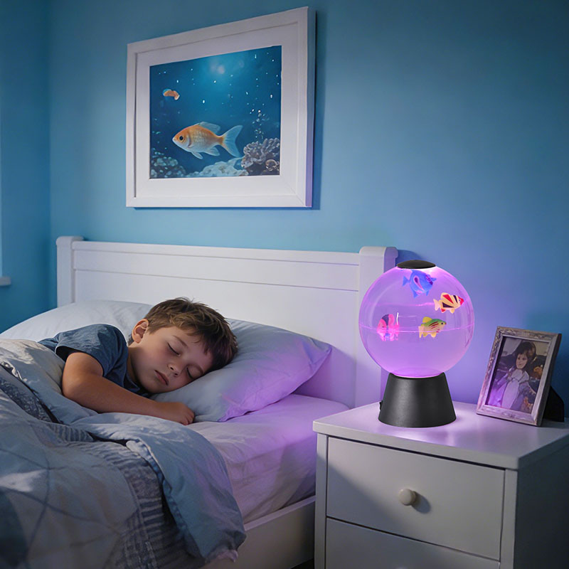 Tato animovaná rybí koule, navržená jako všestranný dekorativní předmět, slouží více účelům: uklidňuje