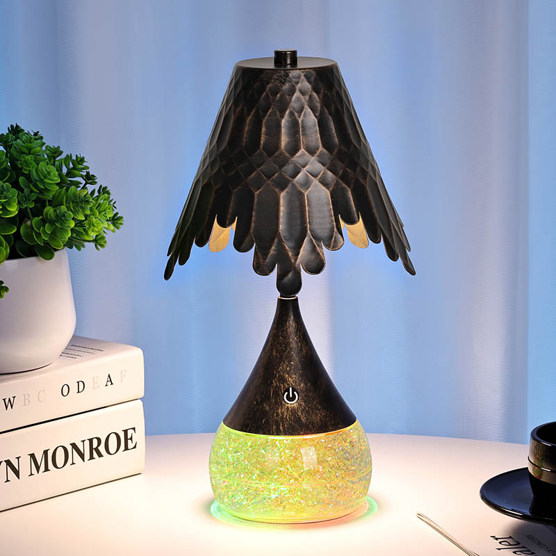 Umístěte teplé světlo LED LED stolní lampa s třpytivou láhev RGB jako prvotřídní inovativní řešení osvětlení, které kombinuje funkce s uměleckým vkusem. Zdůrazněte své jedinečné vlastnosti, jako je dynamická základna RGB a nastavitelné režimy osvětlení, aby se odlišily od konkurentů.