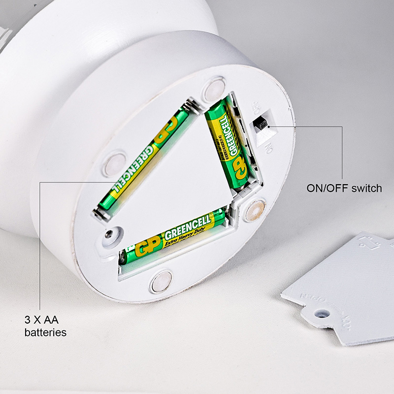 Není třeba zapojovat; může být napájen pouze 3 bateriemi AAA, vyznačuje se jednoduchou instalací a flexibilním použitím. Ať už je umístěn na nočním stolku, stole, dětské postýlce nebo při kempování