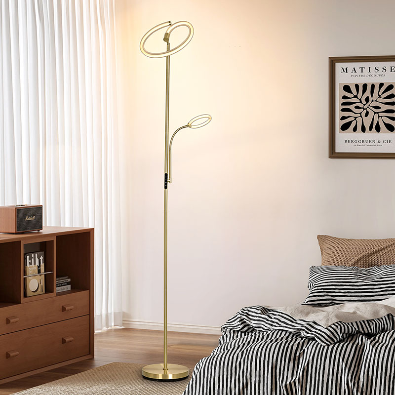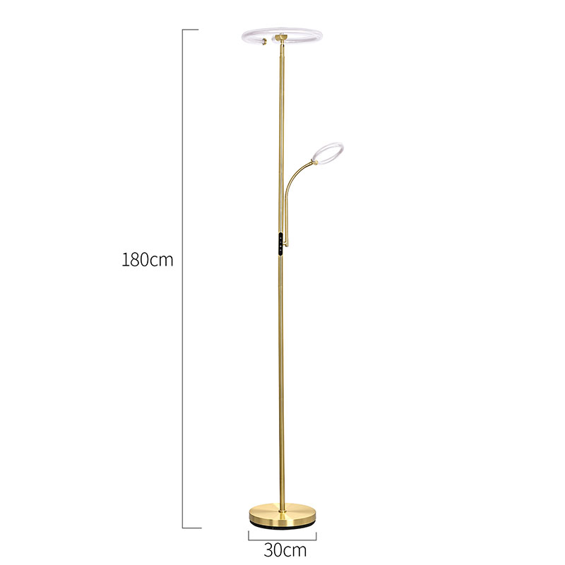 Luxusní zlatá stojací lampa do obývacího pokoje je vyrobena z vysoce kvalitního zlatého kovového materiálu s jednoduchým, ale luxusním celkovým designem. Kovový materiál byl jemně leštěn a ošetřen, s hladkým a jemným povrchem a jemným leskem, který předvádí ušlechtilou a elegantní atmosféru. Ať už je umístěn v obývacím pokoji, ložnici nebo