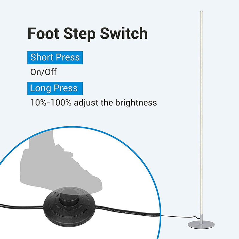 Naše stojací LED lampa byla navržena s ohledem na pohodlí a je vybavena nožním spínačem pro snadné ovládání. Jednoduše sešlápněte spínač pro zapnutí nebo vypnutí lampy, takže ovládání osvětlení je hračka, aniž byste museli hledat tlačítka nebo spínače. Tento promyšlený designový detail vylepšuje celkový uživatelský zážitek a zajišťuje, že ovládání lampy je co nejjednodušší a intuitivní.