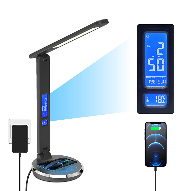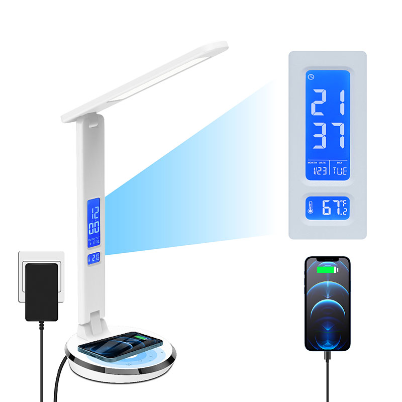 K dispozici je LCD obrazovka se zobrazením teploty, času, budíku, věčného kalendáře s ovládacím tlačítkem na zadní straně těla. A na zadní straně stínidla stolní lampy je nabíjecí port USB.