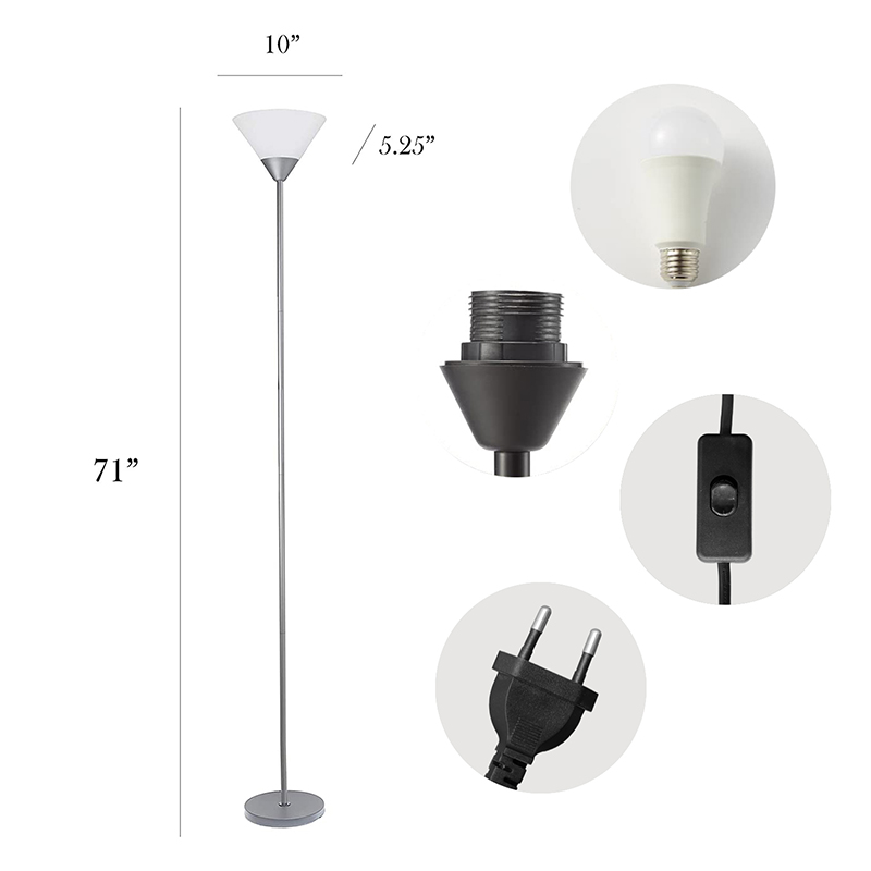 Rozměry LED stojací lampy jsou patice lampy, krytka, vypínač, žárovka