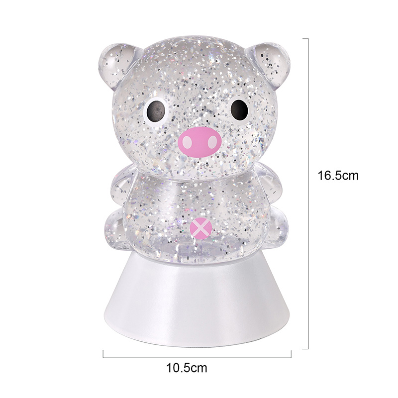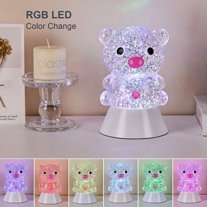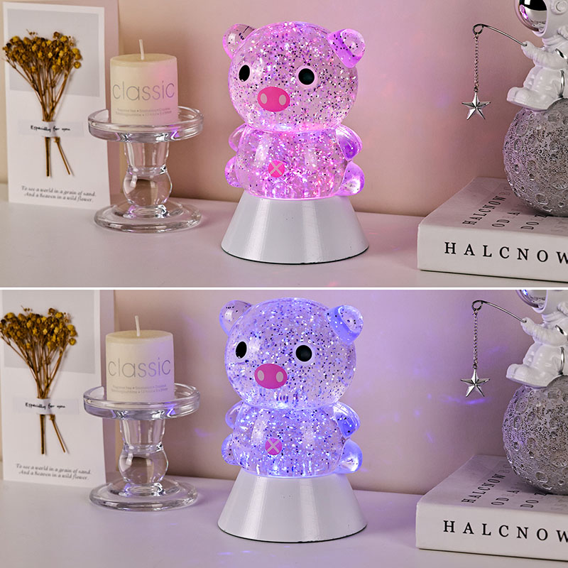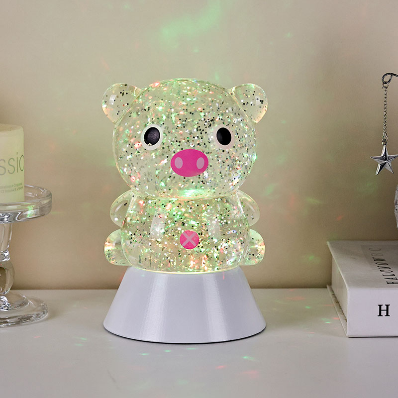 Celkový design se vyznačuje roztomilým a rozkošným obrázkem prasátka s kulatými a baculatými obrysy spojenými s velkýma očima, růžovým čumáčkem a rozkošnými malými ušima, které okamžitě uchvátí srdce dospělých i dětí. Průhledná pryskyřičná skořápka je naplněna jiskřivými barevnými flitry a speciální tekutinou, která při rozsvícení světel jemně stéká s tekutinou a vytváří snový vizuální efekt jako hvězdná řeka proudící v těle prasátka. Světlé barvy se automaticky střídají, přecházejí z jemné růžové a zasněné fialové do svěží modré a zelené a plynule se mění v duhu barev, která vytváří poklidnou, a přesto magickou atmosféru, jako by přiváděla pohádkový svět do reality.