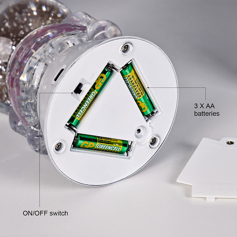 Třpytivá stolní lampa RGB ve stínu prasečího se vyznačuje jednoduchým a elegantním bílým designem spodní části, který nejen zlepšuje celkovou estetiku, ale také zlepšuje stabilitu, aby se zabránilo převrácení. Základna obsahuje vnitřní přihrádku na baterie, kam mohou uživatelé snadno vložit tři baterie AAA (nejsou součástí balení). Bez nutnosti zapojování nabízí přenosnost a je ideální pro umístění vedle postele, stolu, postýlky nebo na cesty. Konstrukce spínače je uživatelsky přívětivá a umožňuje snadné ovládání zapnutí/vypnutí jednoduchým dotykem, díky čemuž je ovládání bezpečné a přímočaré – zvláště vhodné pro samostatné použití dětmi.