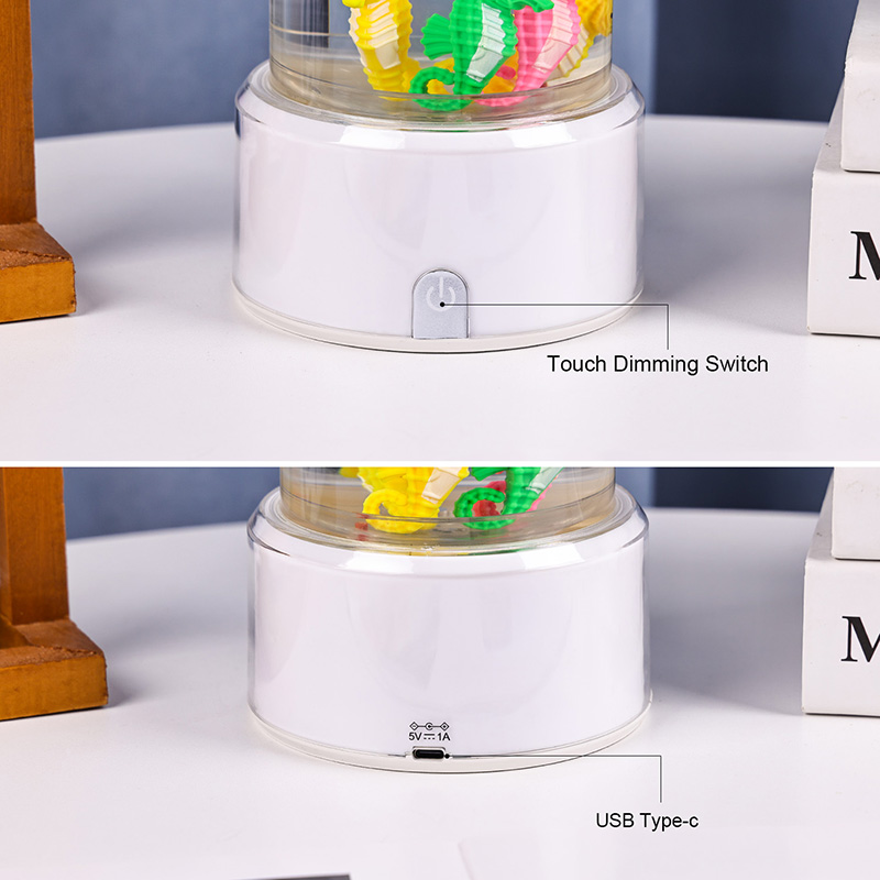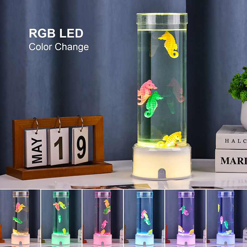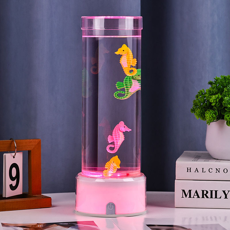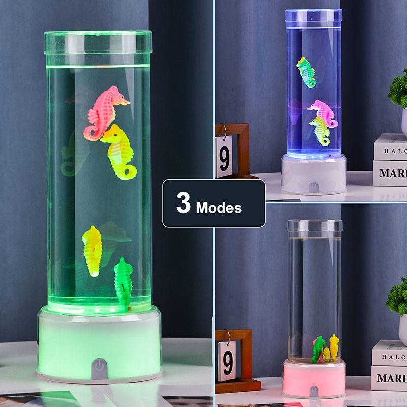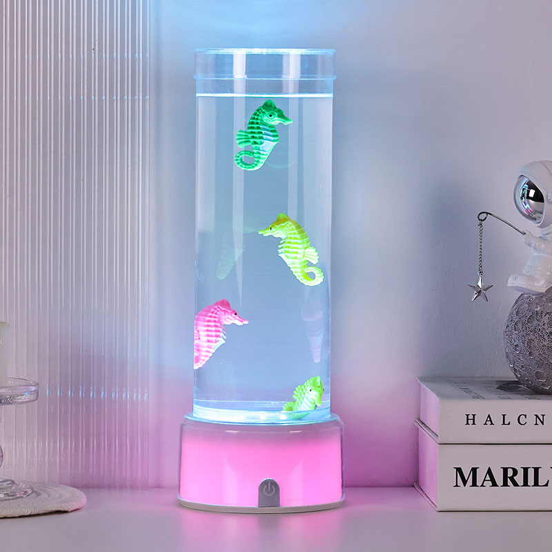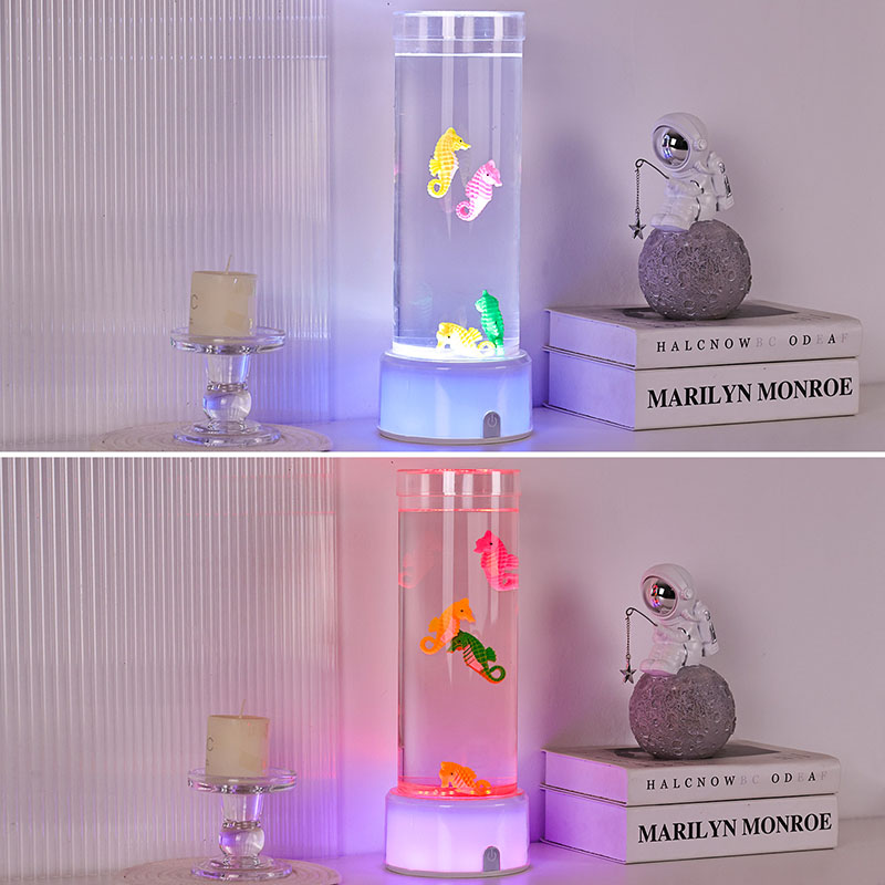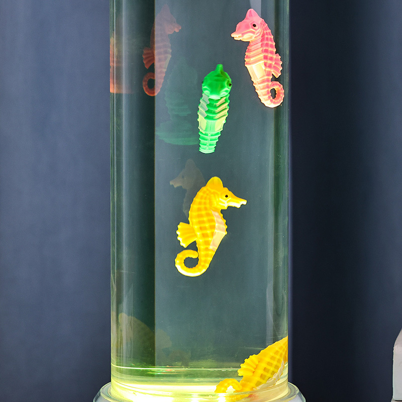 fascinující podvodní scéna, která evokuje klid oceánu Celá jednotka je vyrobena z vysoce kvalitního odolného plastu, který zajišťuje bezpečnost, stabilitu a dlouhotrvající výkon Lampa je vysoká přibližně 12 palců s elegantní průhlednou trubicí naplněnou netoxickou tekutinou a barevnými ornamenty mořských koníků Každý mořský koník je pečlivě vyroben s důrazem na detail se zářivými barvami a realistickými texturami, které se ladně vznášejí v přirozeném vnitřním systému proudění tekutiny Tento jemný pohyb je uklidňující a pomáhá snižovat stres a zároveň poskytuje uklidňující vizuální zážitek