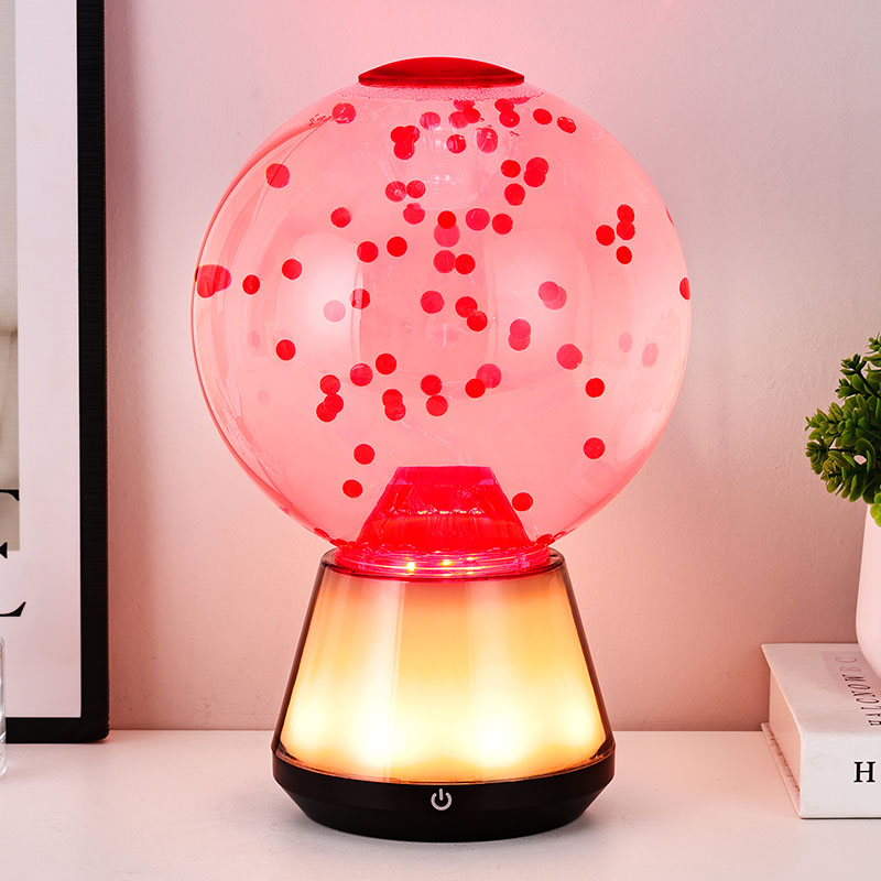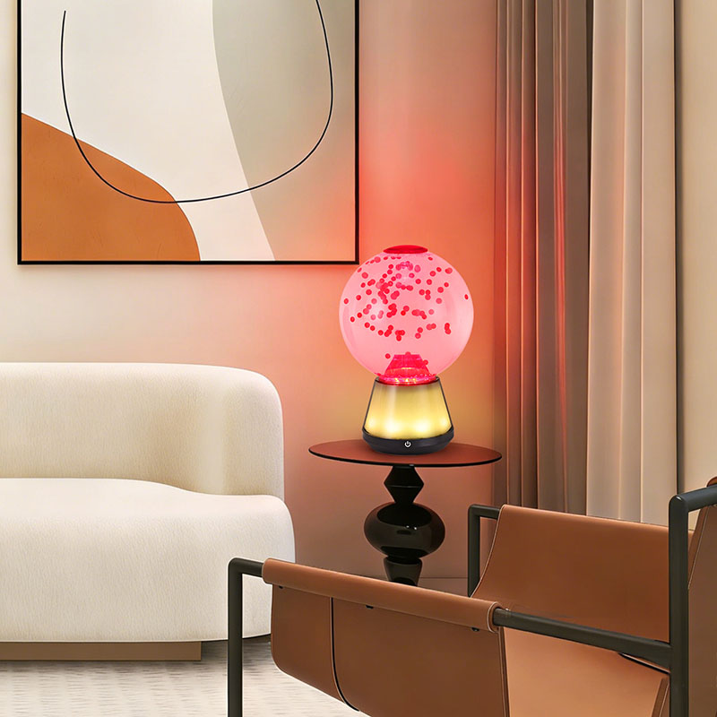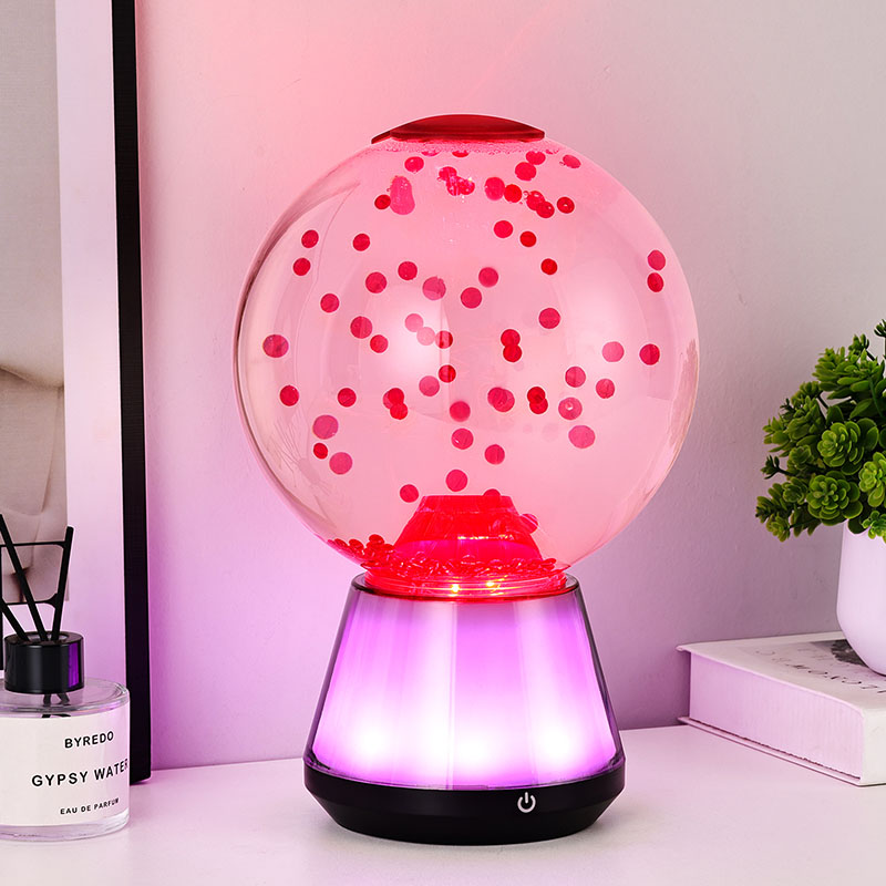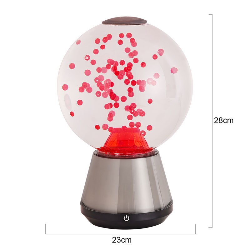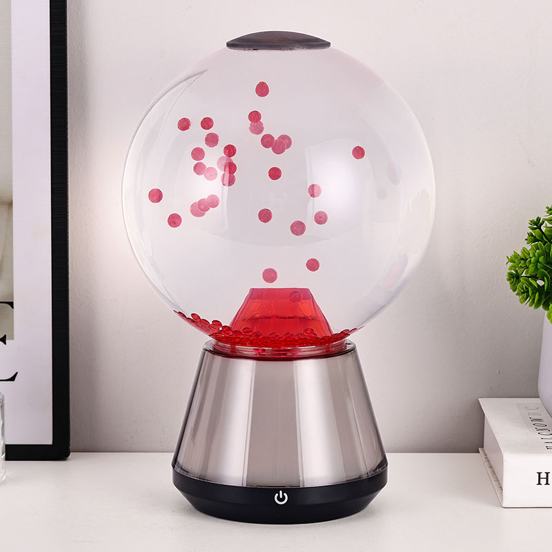Lampa má kulatý design ve tvaru koule s hladkým lesklým povrchem, který umožňuje, aby se světlo krásně odráželo přes povrchy Uvnitř zeměkoule se stovky malých červených kuliček vznášejí vzhůru v rytmických vlnách poháněných tichým oběhovým čerpadlem Tento pohyb simuluje sopečnou činnost a vytváří dojem roztavené horniny stoupající z hlubin země Základna svítí barevným RGB osvětlením, které se cyklicky mění v různých odstínech včetně červené oranžové žluté, modré a zelené.