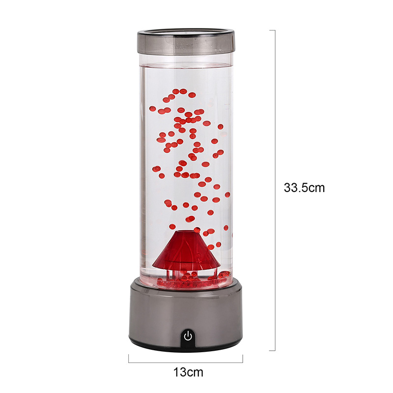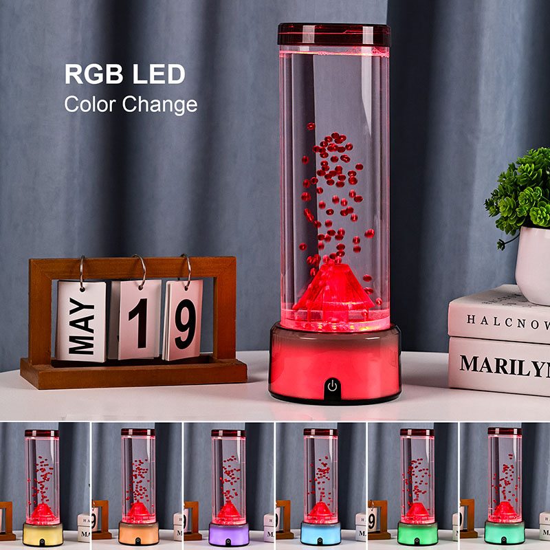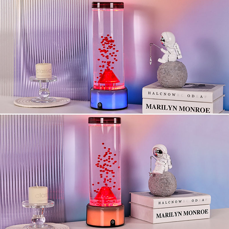 Tato LED lampa ve tvaru sopky, navržená s pečlivou pozorností k detailu, má válcovou kapalinovou komoru naplněnou čirou tekutinou a plovoucími červenými částicemi, které při aktivaci simulují sopečnou erupci. Základna lampy svítí zářivými, barvy měnícími RGB světly, zatímco centrální struktura sopky pulzuje ohnivým osvětlením a napodobuje skutečnou erupci. Jemné dekorace podobné medúzám se zároveň ladně vznášejí ve sloupci kapaliny a dodávají surrealistickou podvodní atmosféru. Společně tyto prvky vytvářejí okouzlující vizuální podívanou, která kombinuje sílu přírody s elegancí moderního designu. Design a estetický vzhled RGB barevně měnící sopečná lampa je vysoká přibližně 12 palců, takže je ideální pro umístění na stoly, noční stolky, police nebo jako nápadný dekorativní kousek v obývacích pokojích, ložnicích nebo dokonce třídách. Jeho elegantní, moderní silueta se vyznačuje průhlednou válcovou trubkou vyrobenou z vysoce kvalitního plastu odolného proti rozbití, který zajišťuje odolnost a bezpečnost. Horní víko je bezpečně utěsněno, aby se zabránilo úniku, zatímco základna je vyrobena z hladkého plastu s matnou povrchovou úpravou s vestavěným ovládacím panelem.