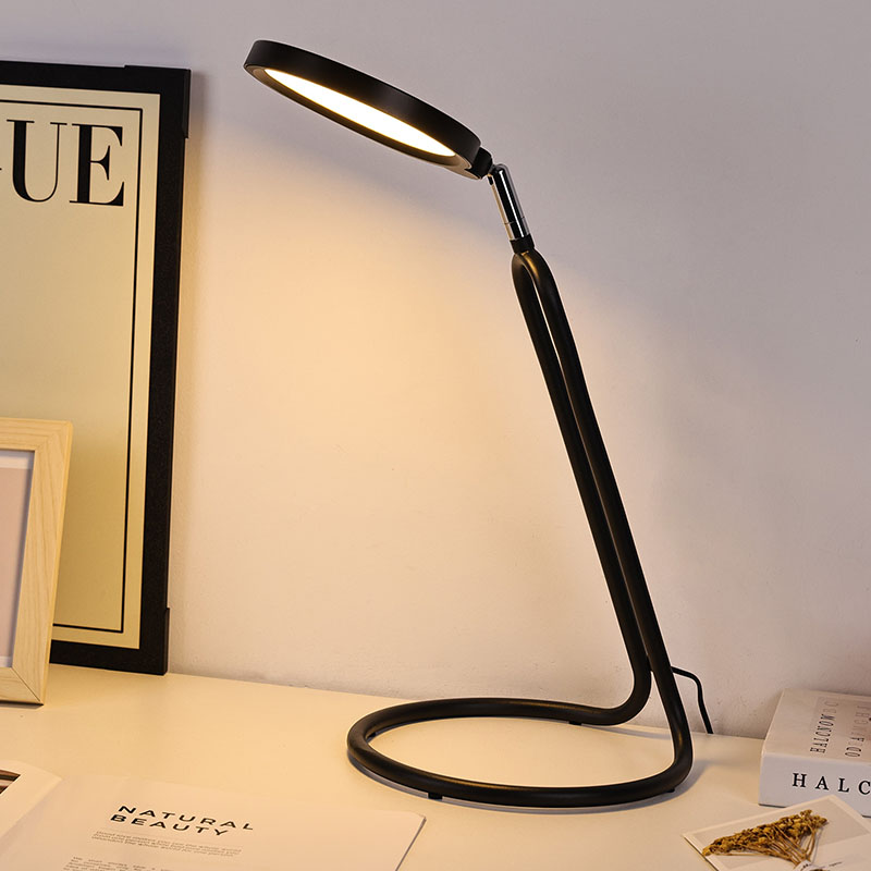 Stolní lampa pro jednoduchou jednoduchost má výrazné černobílé barevné schéma se zakřiveným kovovým stojanem, který podporuje kulatý, bílý nebo světle žlutý stín. Tento design nejen vypadá fantasticky, ale také slouží k poskytování měkkého okolního osvětlení, které přeměňuje váš pokoj na útulné útočiště.