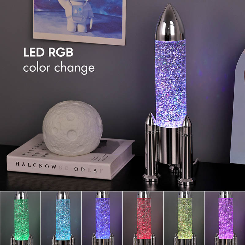 Rsliver noční světlo s tvarem rakety - hvězdná dekorativní dárkovnice, zázraky moderního dekorativního osvětlení s naším tvarem rakety RGB Změna barevné lávové lavy. Tato inovativní a vizuálně ohromující lampa spojuje estetickou přitažlivost rakety s fascinujícím efektem lávových lamp, vylepšená technologií měnící barvu RGB. Je to perfektní směs formy a funkce, která je navržena tak, aby zaujala a přidala dotek futuristické elegance do jakéhokoli prostoru. Design a estetika a estetiku RGB Změna barev Lava je důkazem vynikajícího designu a řemeslného zpracování. Jeho elegantní tvar inspirovaný raketou není jen kývnutím na průzkum vesmíru, ale také prohlášení o současném stylu. Hlavní tělo lampy je uzavřeno v šumivém třpytku, který se pod světlem krásně třpytí a přidává nádech kouzla a sofistikovanosti.