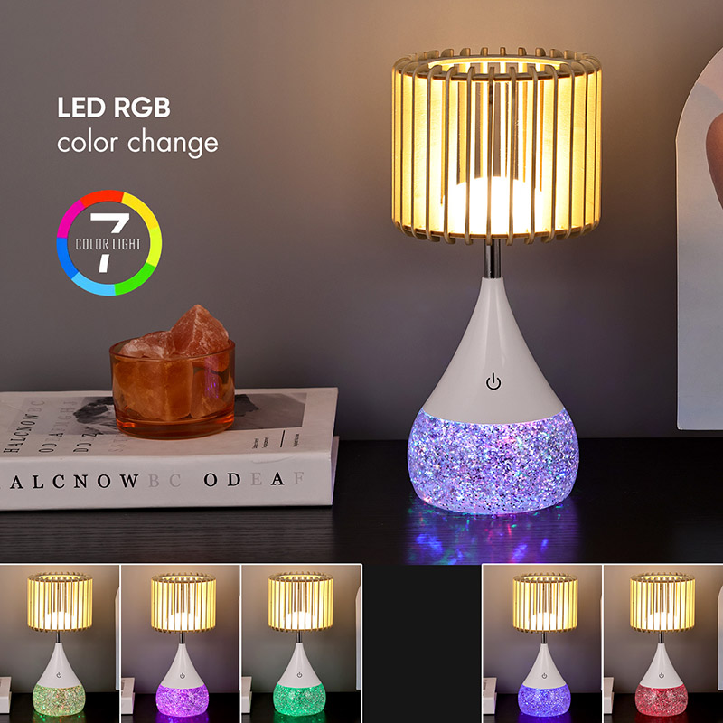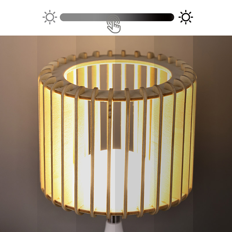 Design:** Unikátní dřevěné lamelové stínidlo, RGB základna měnící barvu
